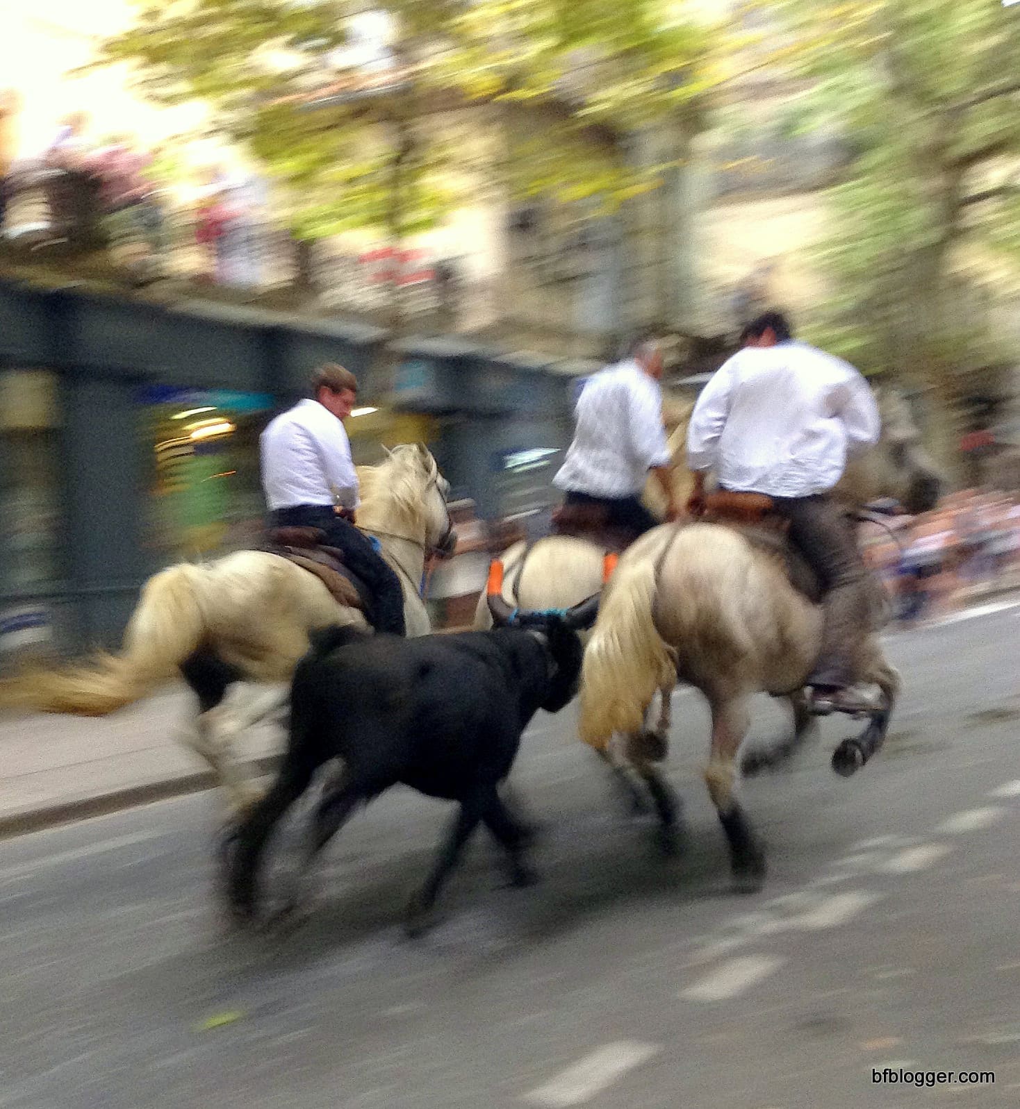 Thinking I had missed getting a shot of the bulls, I saw that the young people standing near me — Arnaud and his friends from Normandy — had captured the action on video. They were more than happy to share it for the blog.